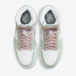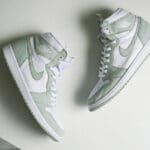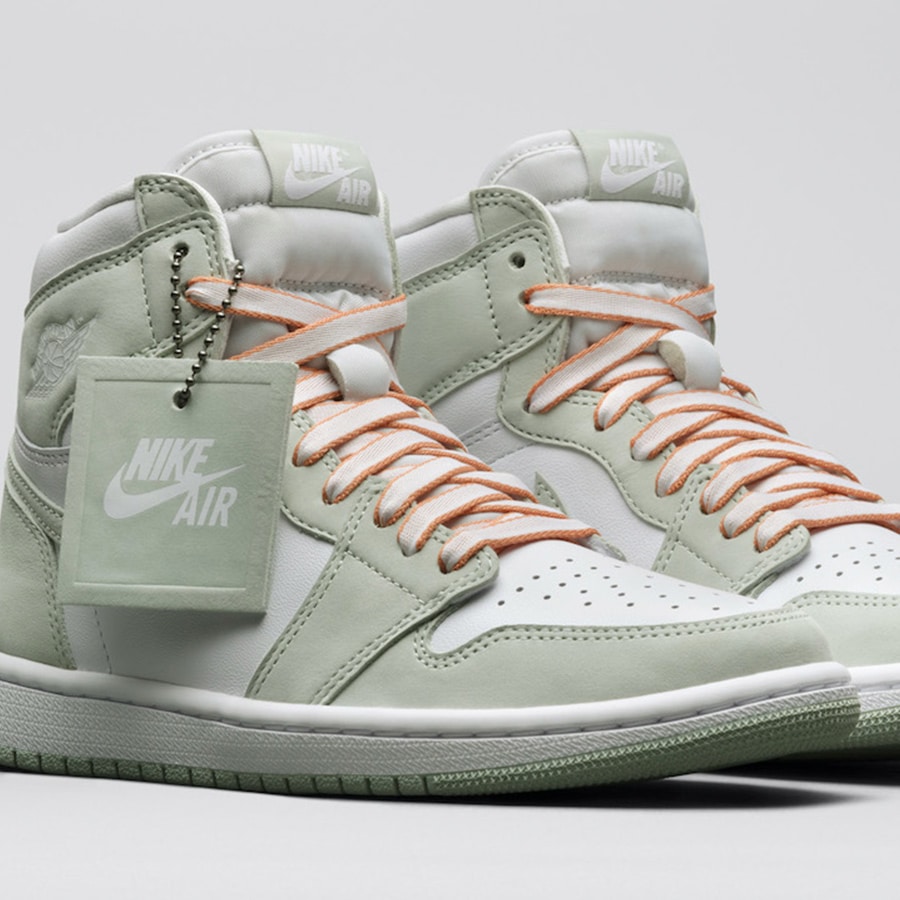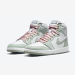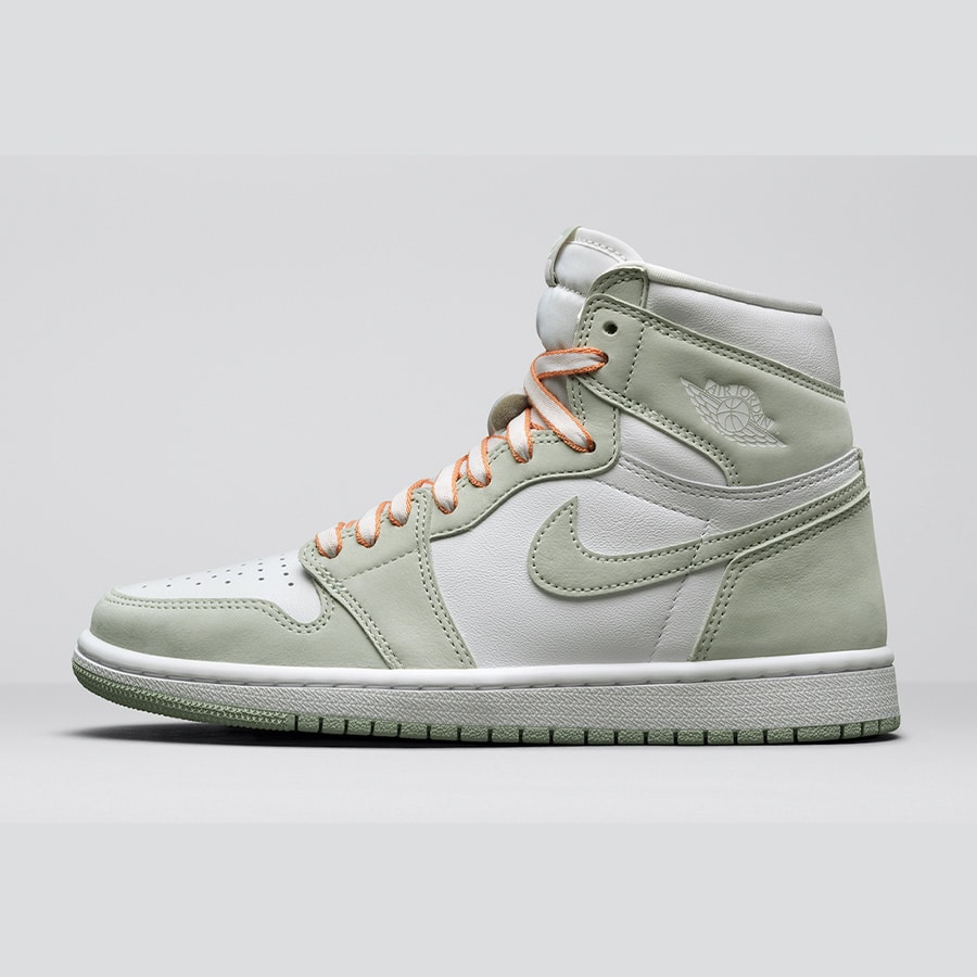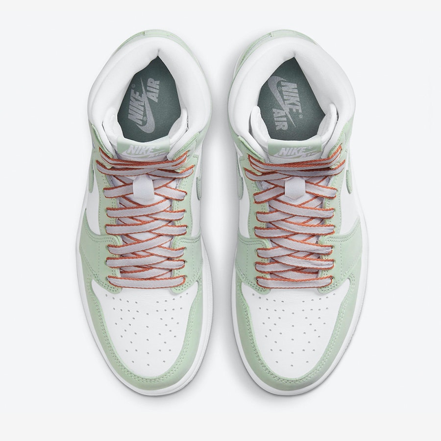 The Women’s Air Jordan 1 High OG “Seafoam” is a women’s version of Michael Jordan’s first signature shoe in a colorway that was released in Summer 2021. Channeling an aquatic vibe, the “Seafoam” design is an ideal footwear option for the warm weather months. Details include white leather on the perforated toe and mid-panel and Seafoam-colored leather on the forefoot, eyelets, collar, heel, and Swoosh. A white “Wings” graphic appears on the collar and “Nike Air” branding can be found on the Seafoam nylon tongue tag. Unique white laces with Healing Orange-colored trim appear on the white nylon tongue. The “Seafoam’s” color block is reminiscent of the design on the model’s original “Chicago” look. Underfoot, a white rubber midsole and Seafoam outsole put the finishing touches on this women’s-only colorway. Release date: August 12, 2021