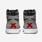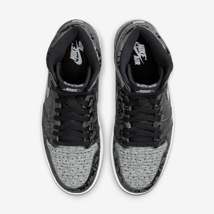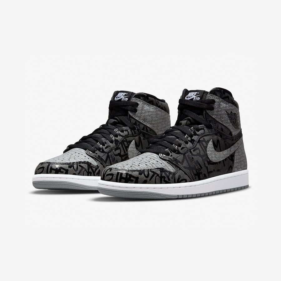 The Air Jordan 1 Retro High Rebellionaire draws inspiration from the original Air Jordan 1 Shadow with its simple black and grey color blocked upper. Printed on the leather construction, graffiti style text covers the upper. At the base, a white and grey Air sole completes the design.