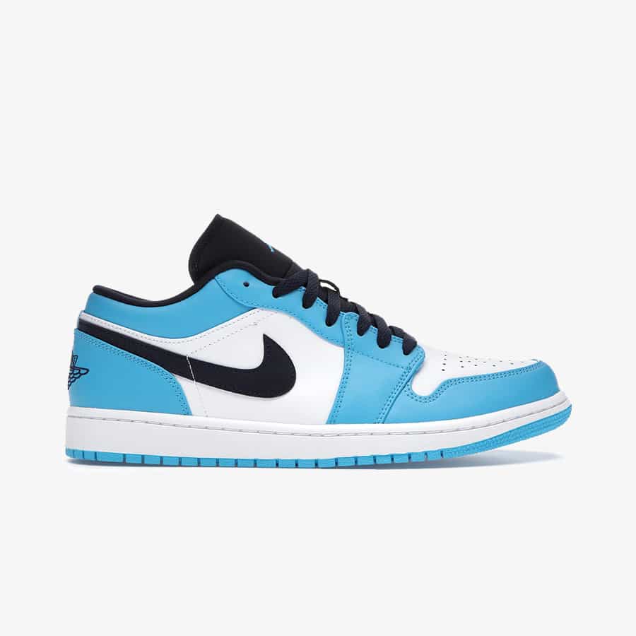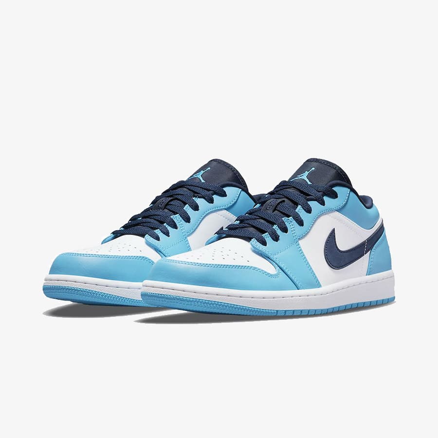 he Air Jordan 1 Low UNC 2021 for grade schoolers (GS) arrives with a white leather upper with University Blue overlays and obsidian Swoosh. The Air Jordan 1 Low UNC 2021 (GS) features a white leather base with University Blue overlays. Several navy-blue accents on the laces, Wings, and tongue provide a slight contrast to the overall look. There is a University Blue Jumpman on the tongue and a navy-blue embroidered Jordan Wings on the heel. Underfoot, a clean white midsole and University Blue outsole finish the design.